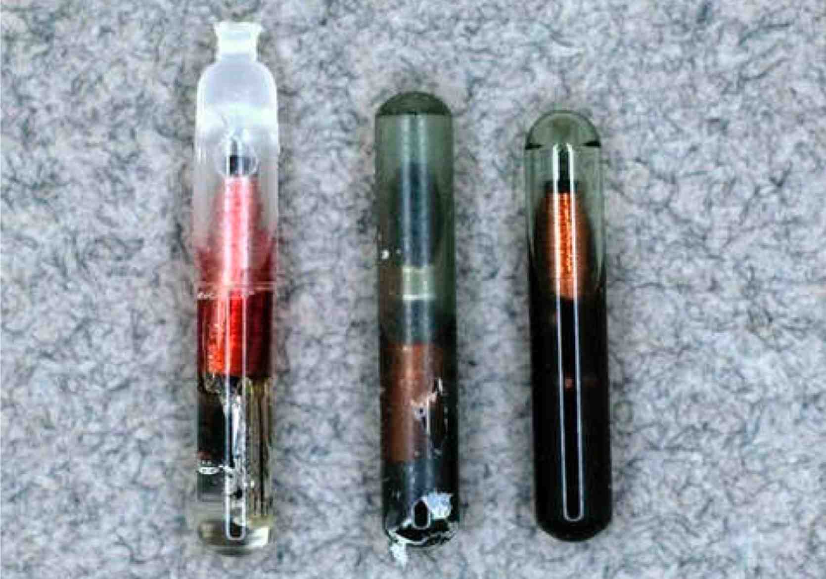 Here is a photo showing one competitor's ‘anti-migration’ cap, and another competitor's parylene-coated microchip next to a Trovan microchip (far right). The Trovan microchip, at 11.5 mm, is the smallest of these. The microchips with “anti-migration” devices do on occasion migrate--irrespective of their alleged "anti-migration" features.