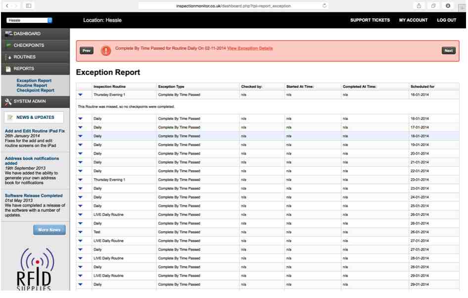 If any triggers are detected by the system an ‘exception’ is created and an alert sent to one or more people via email and SMS.