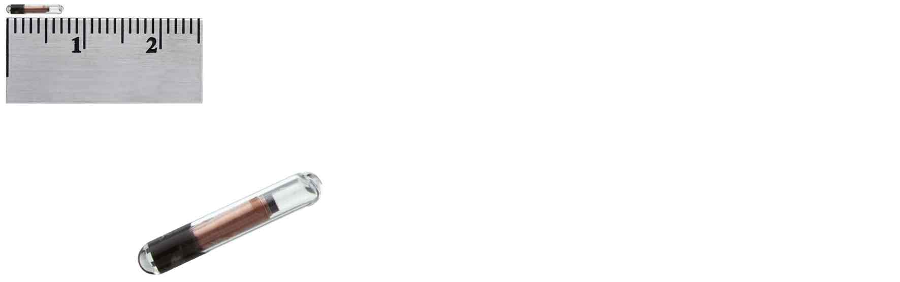 - Glass encapsulation is twice as thick as the standard ID-100 glass encapsulation, allowing transponder to survive rollers, garment presses, etc.